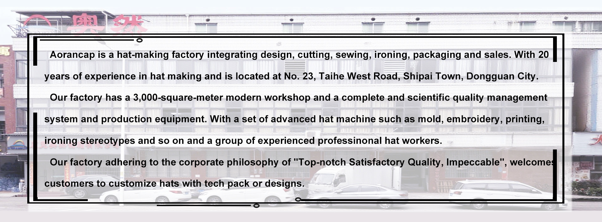 Aorancap is a hat-customizing factory integrating design, cutting, sewing, ironing, packaging and sales. With 20 years of experience in hat customizing.