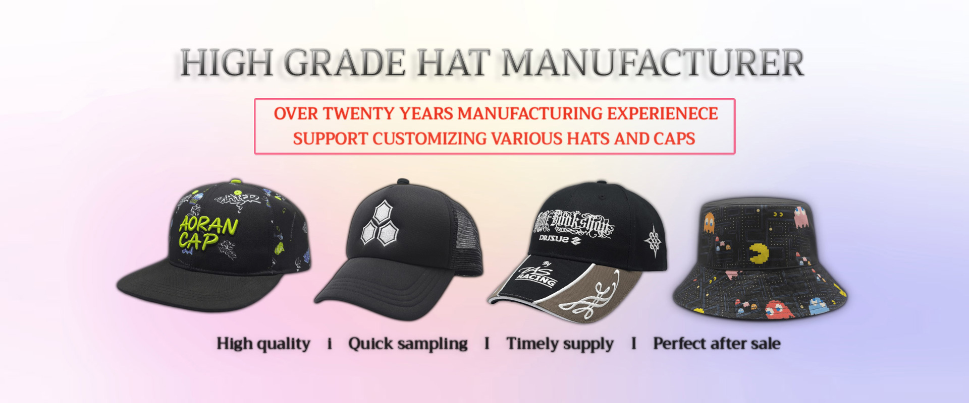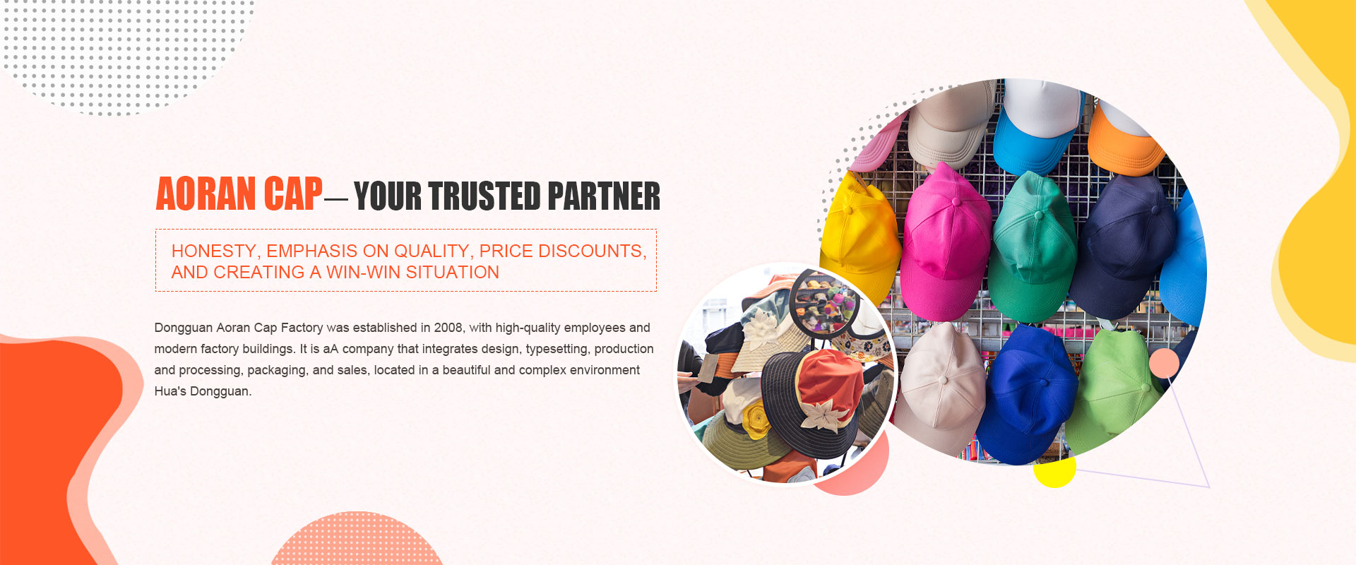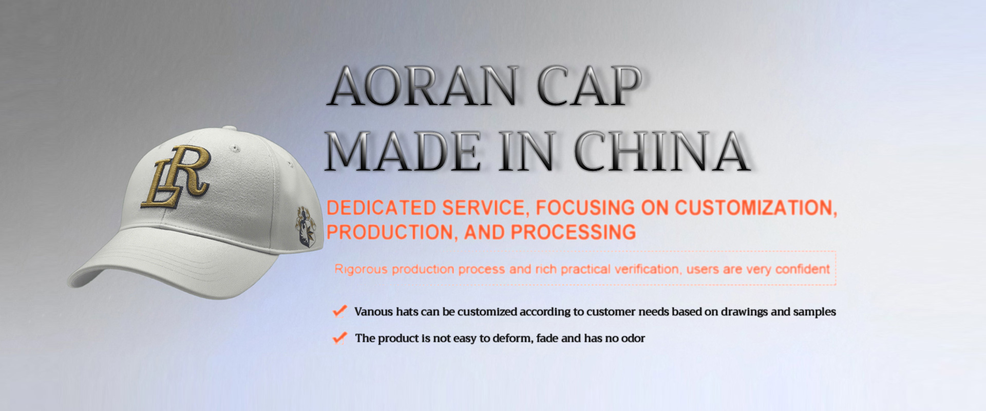 Aorancap is a hat-customizing factory integrating design, cutting, sewing, ironing, packaging and sales. With 20 years of experience in hat customizing.