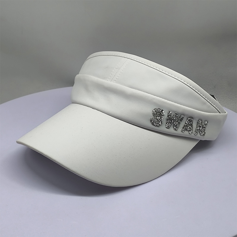 "This is a white visor hat featuring rhinestone-embellished 'SWAN' lettering on the front band. It’s designed with a brim for sun protection, using decorative rhinestone application as the key craft."