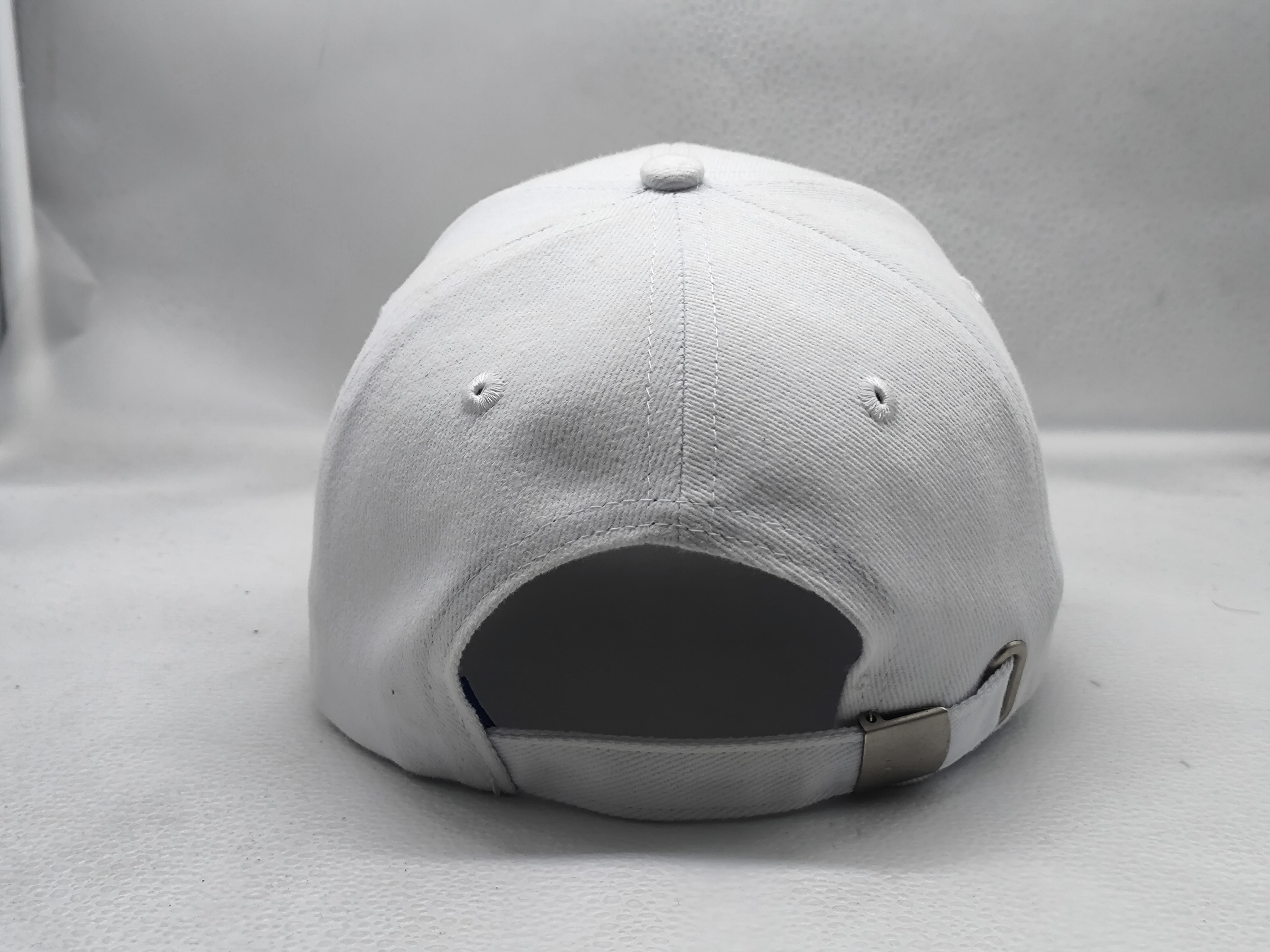 PRODUCT DETAILS *Style: white curved brim 6 panel baseball cap *Composition: 100% cotton *Techniques: 3D puff embroidery and printing *Color: white *Closure: adjustable metal buckle *Size: one size |