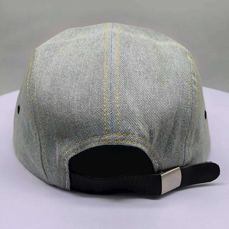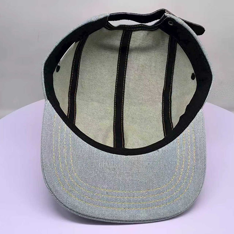 Style: flat brim 5 panel running cap Composition: 100% denim Techniques: leather label Color: blue Closure: leather metal buckle Size: 58 cm |