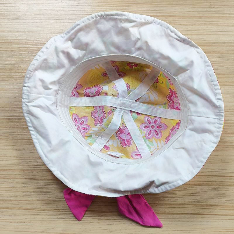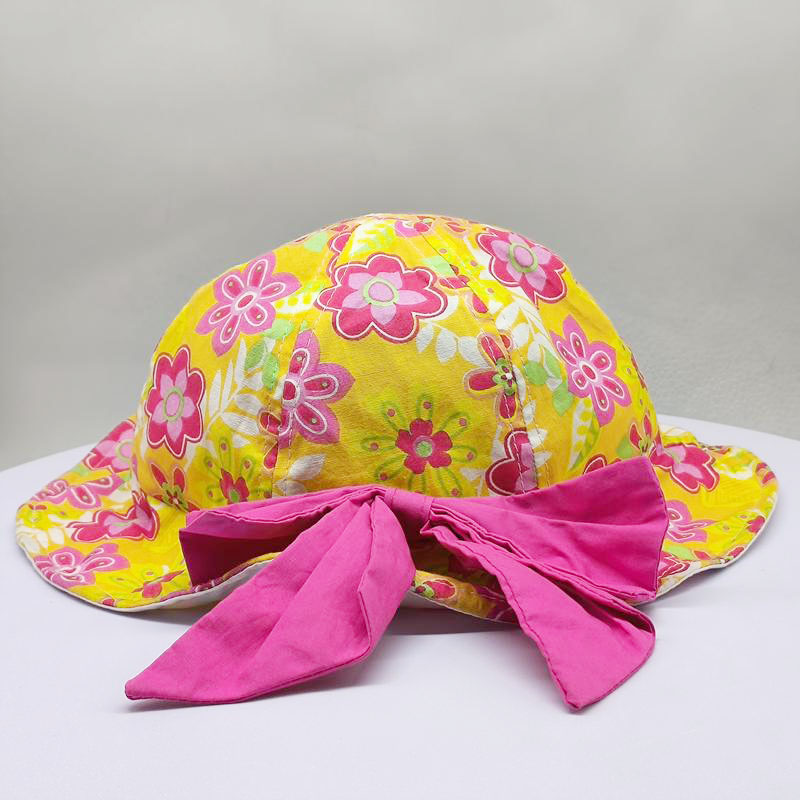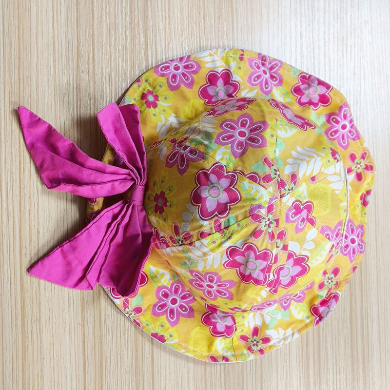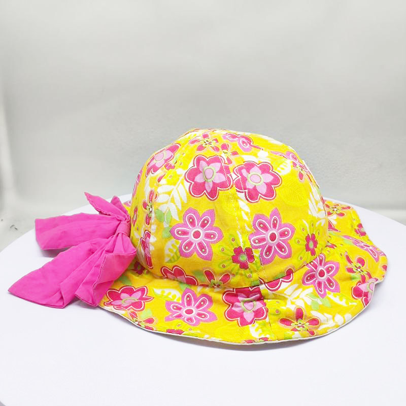 Style: baby cotton beach hat with big bow Composition: 100% cotton Techniques: screen printing Color: yellow and pink Size: 48-52 cm |