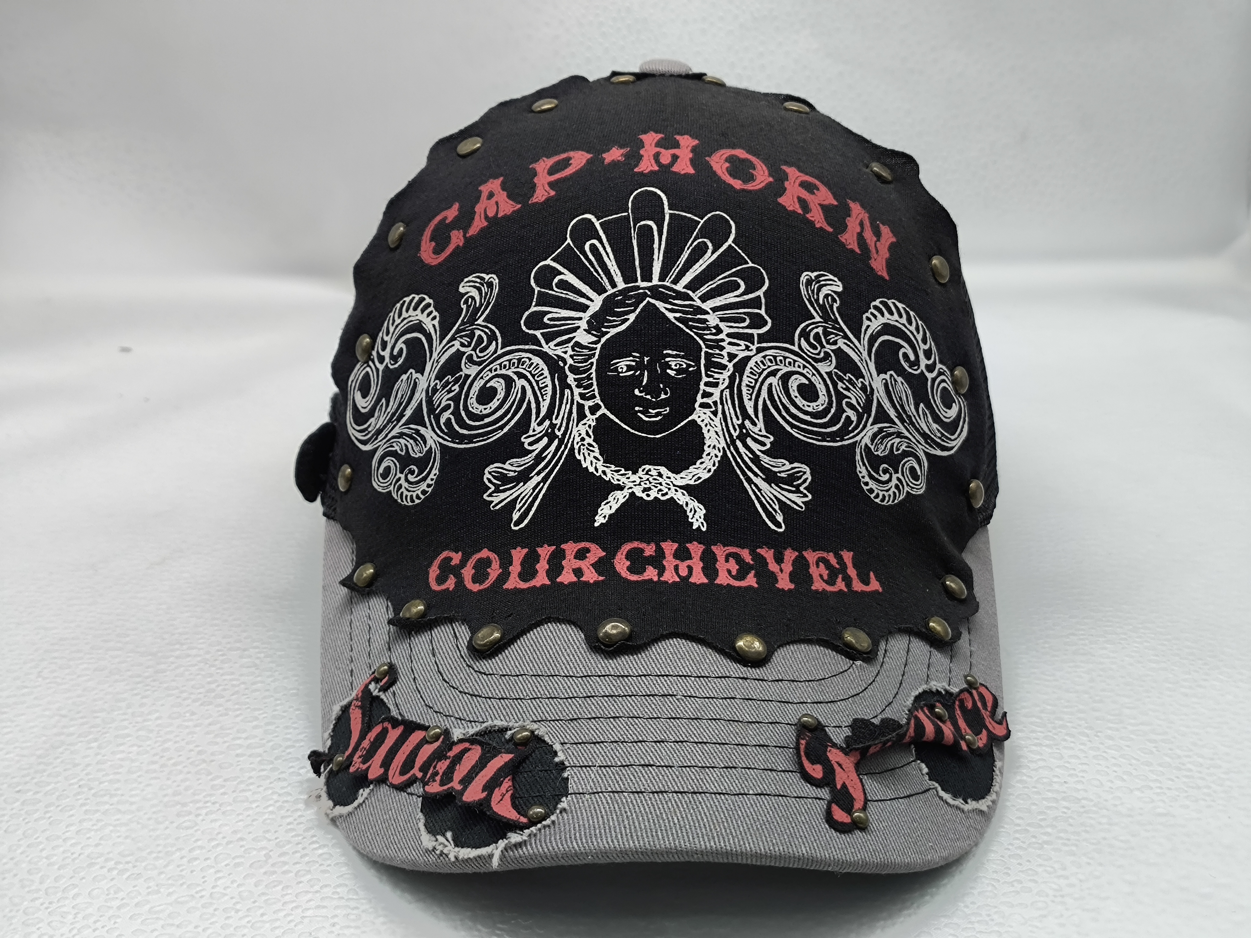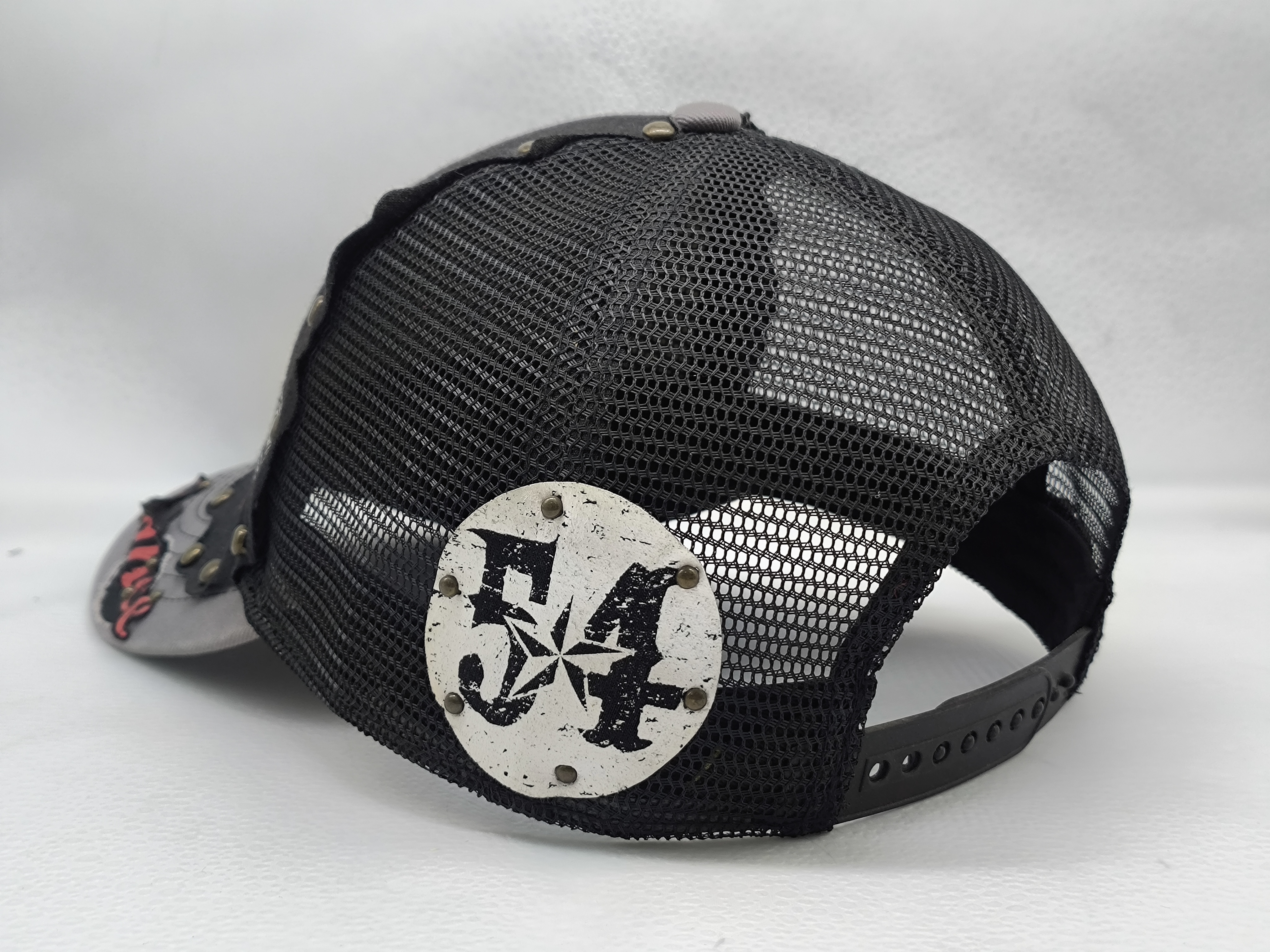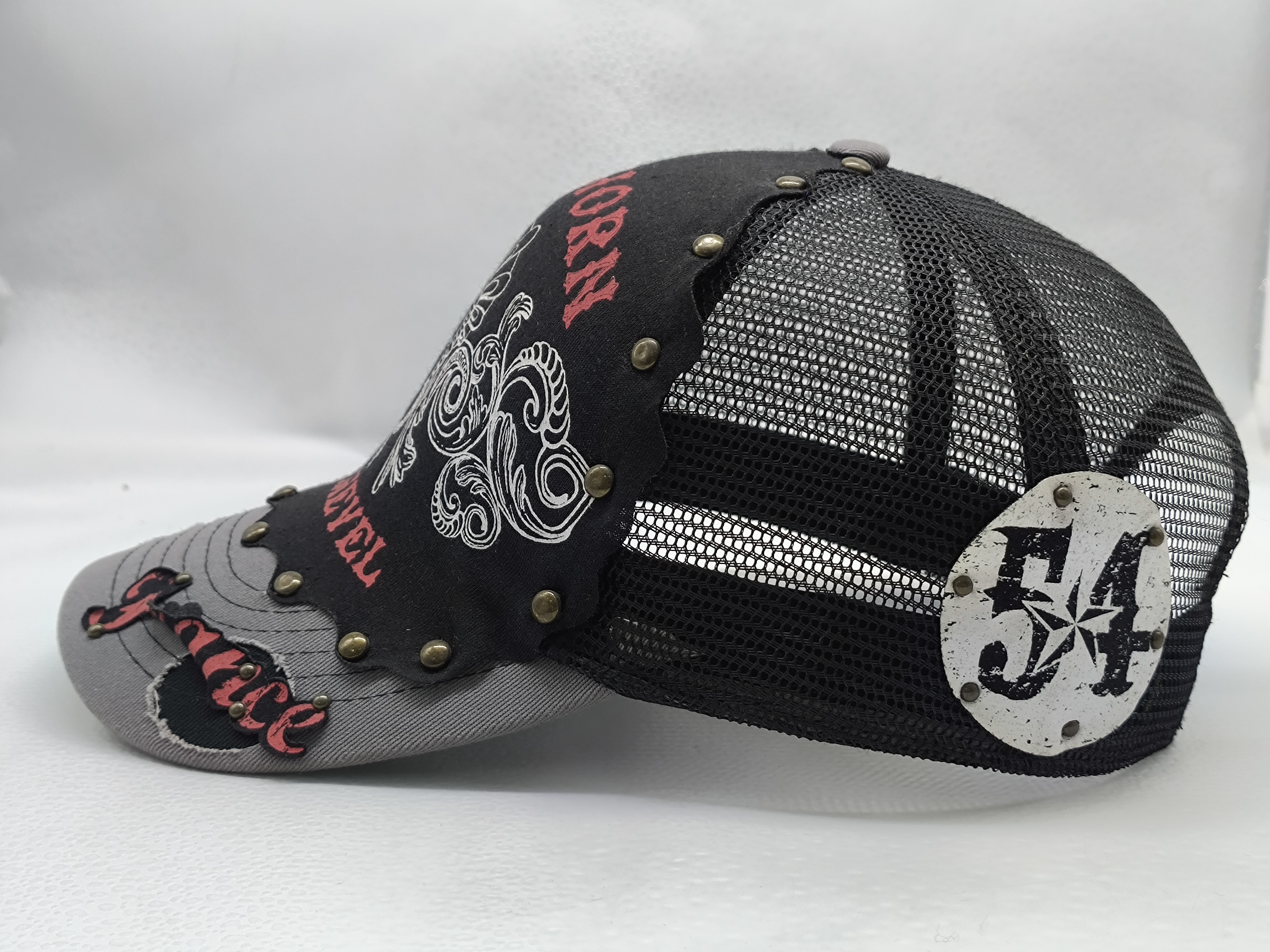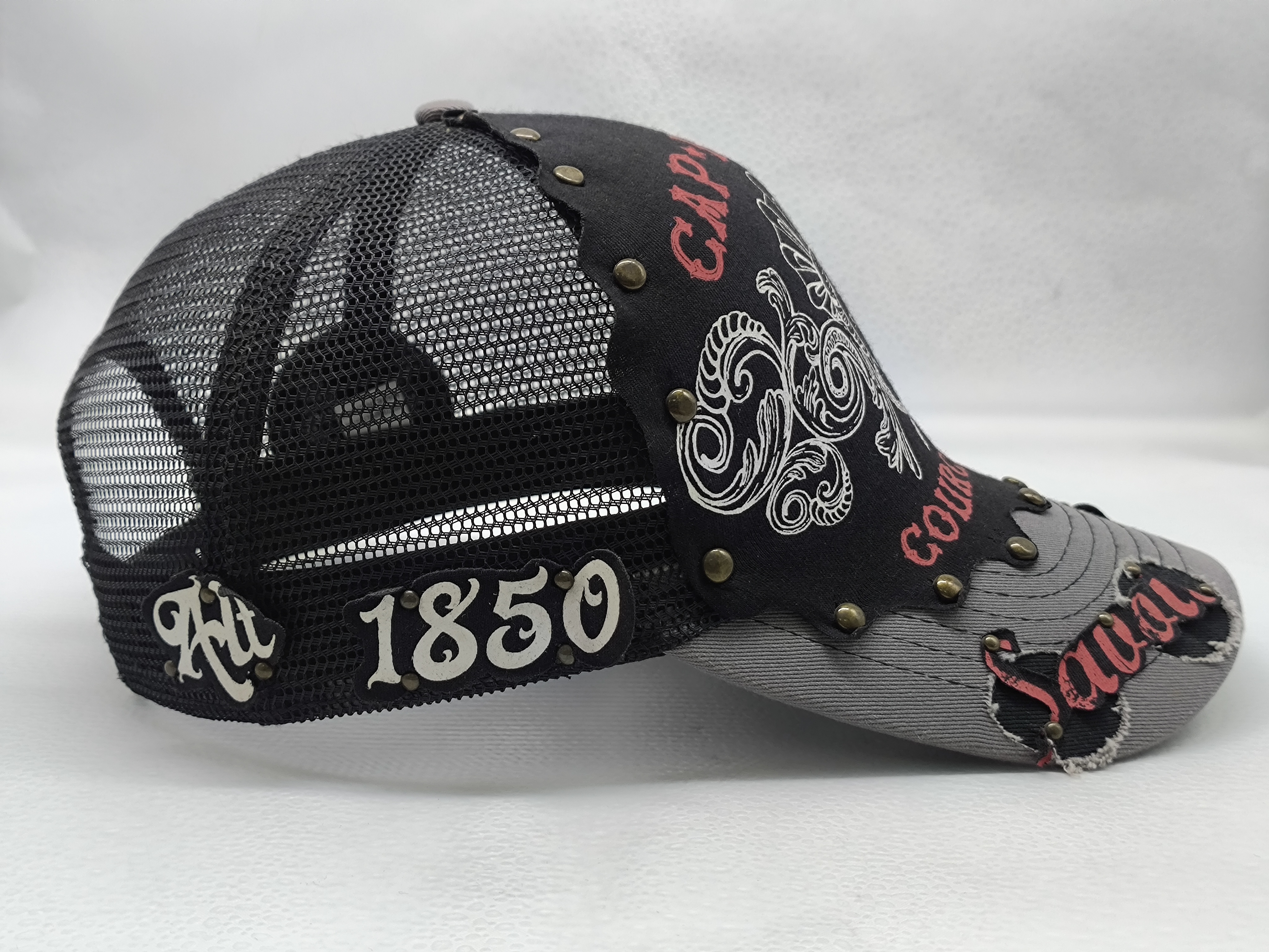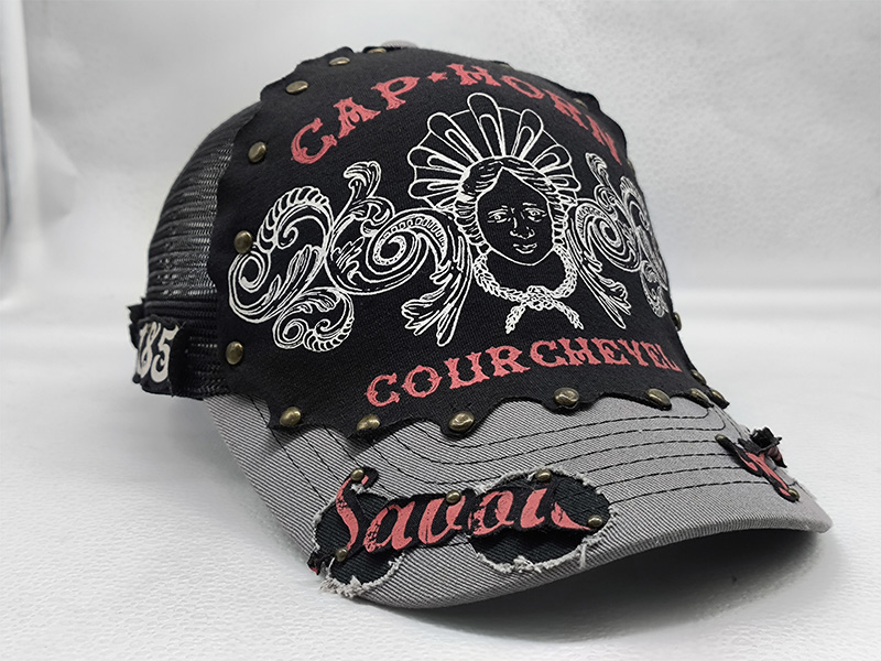 *Style: black curved brim 6 panel snapback trucker cap *Composition: 100% cotton front with 100% cotton brim *Mesh: breathable polyester mesh back and sides *Techniques: 3D embroidery and flat embroidery *Color: black *Closure: adjustable buckle *Size: one size |