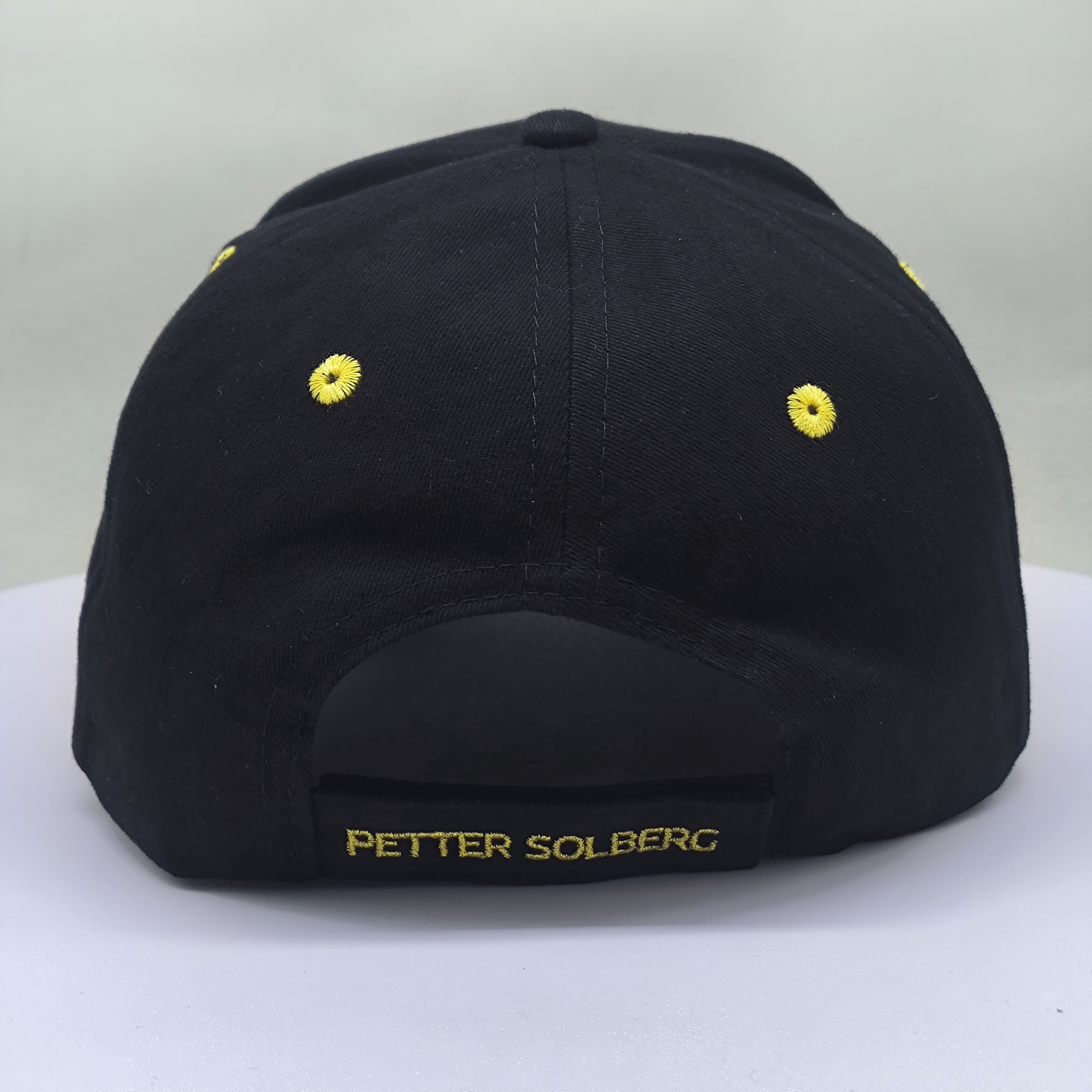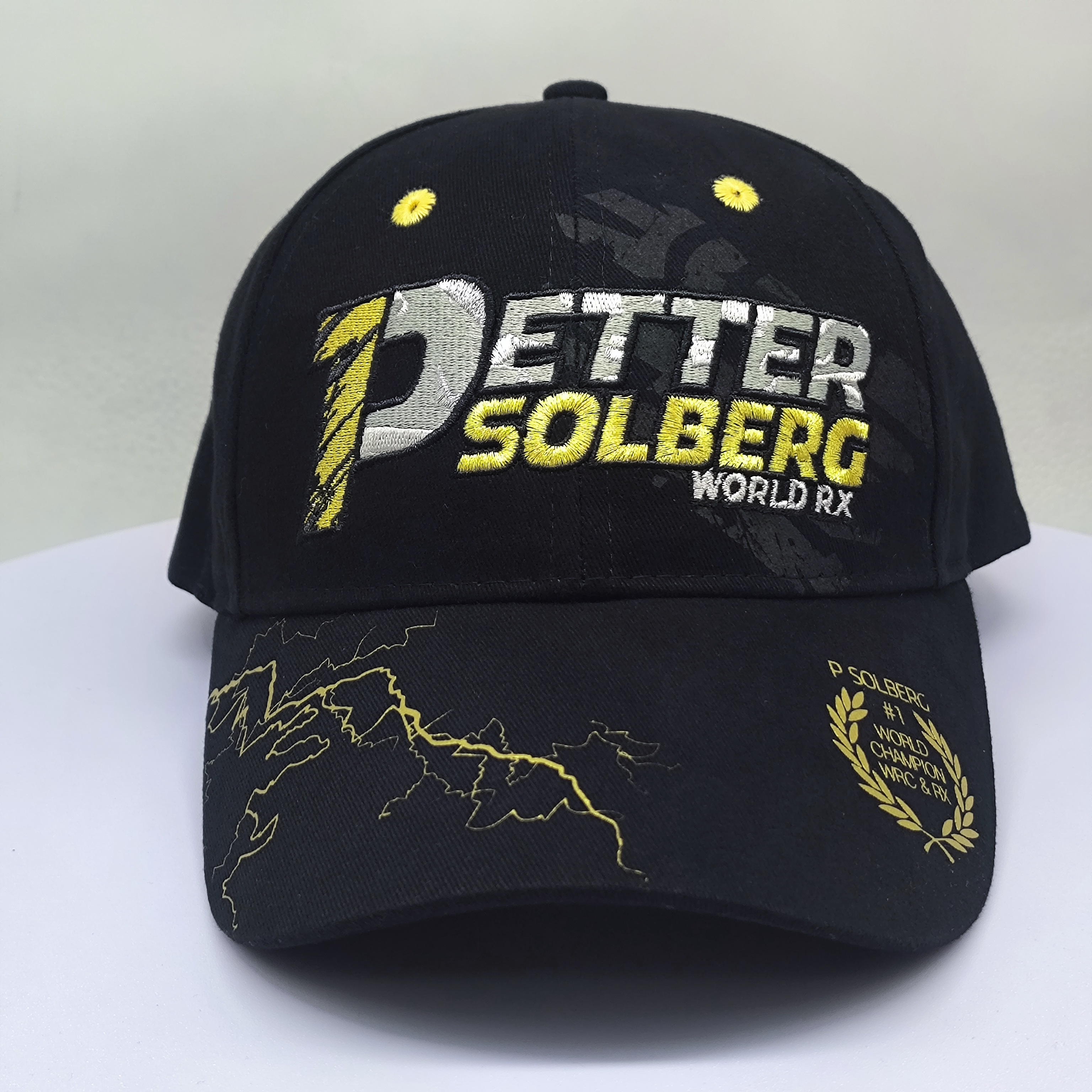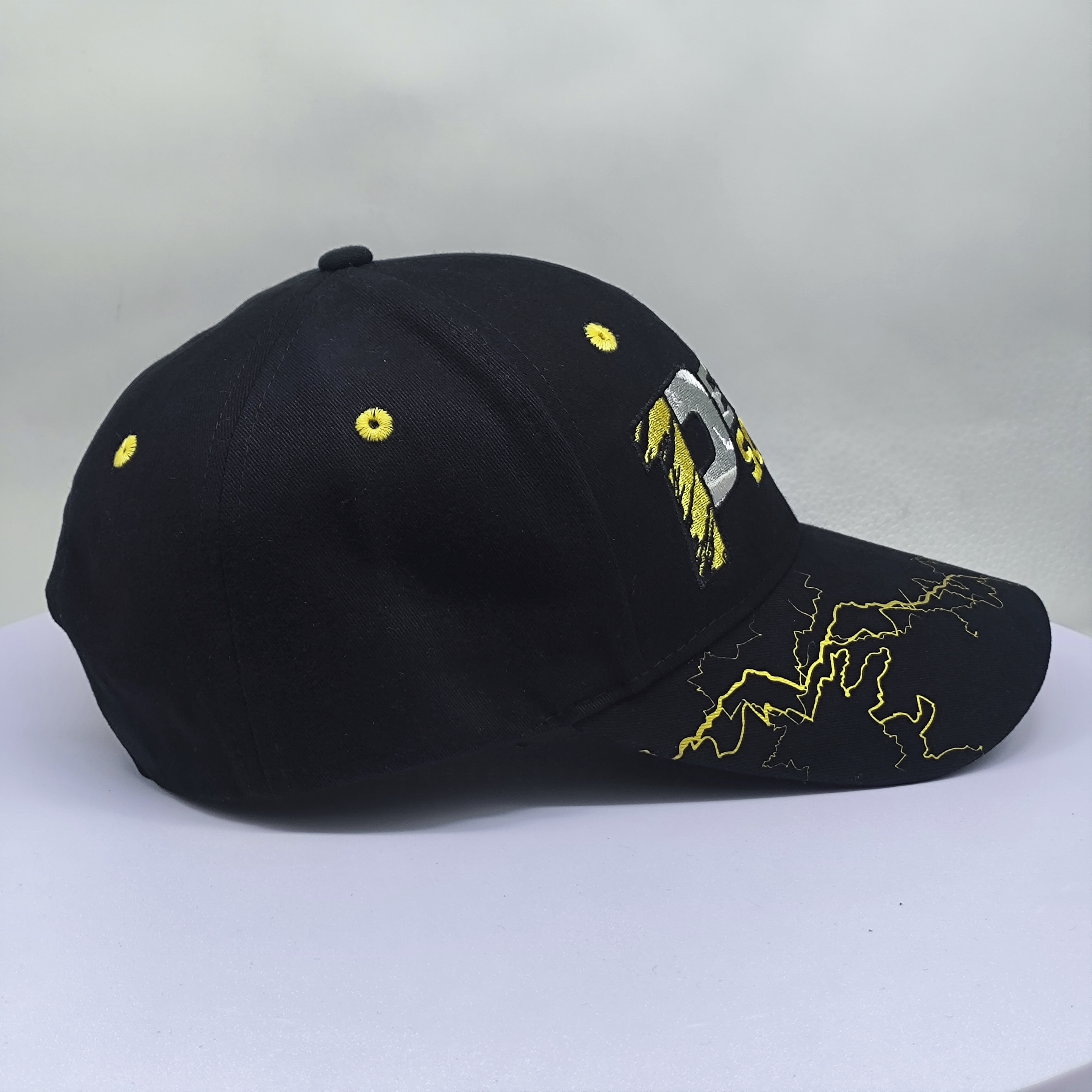 *Style: black curved brim 6 panel baseball cap *Composition: 100% cotton *Techniques: embroidery and printing *Color: black *Closure: adjustable velcro *Size: one size |